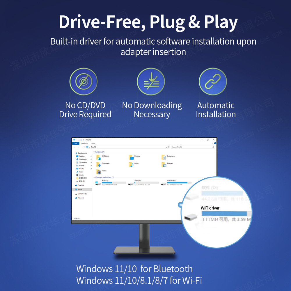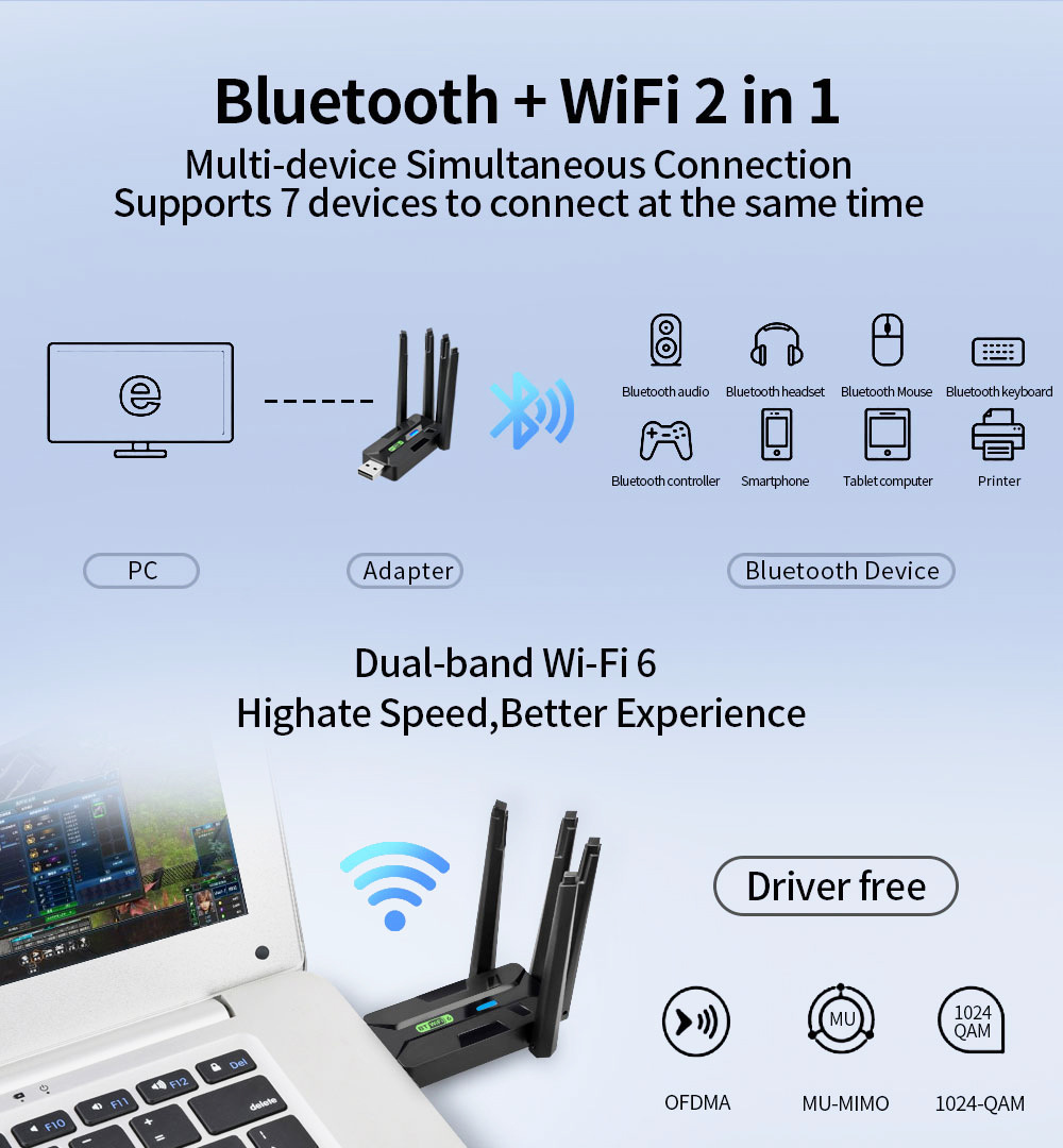 AX940 Dual-band Wireless Network Card + Bluetooth 5.4 2-in-1, suitable for desktop PCs and other devices for wireless connection, providing a convenient and fast way to access the internet. The network card features an automatic detection function, which can automatically adjust the rate.