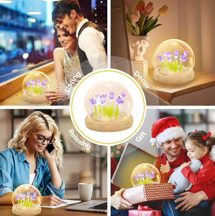 This lamp is absolutely enchanting! The glowing purple tulips are so delicate and beautiful inside the glass dome, casting a soft, warm light that makes the whole room feel cozy. The wooden base adds a lovely, natural touch. It's a perfect piece of decor that adds a bit of magical charm to any space!